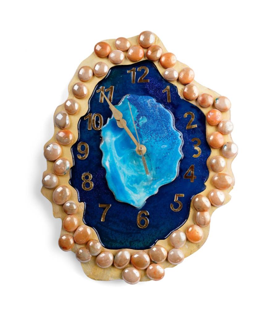 Artistic, handcrafted  beautiful sea-effect resin wall clock featuring a stunning blue and gold colour scheme with elegant gold numbering for a modern, sea face look